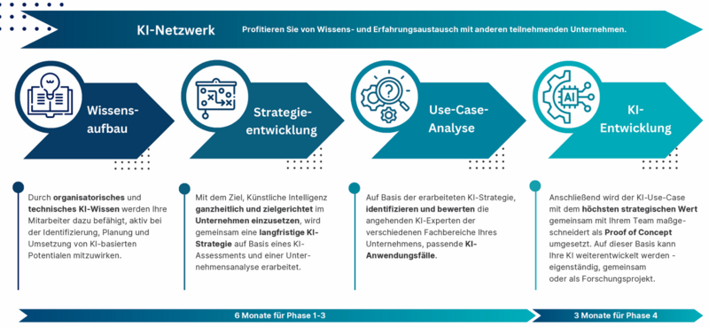 Zu festen Startterminen werden in neunmonatigen Sprints KI Use Cases identifiziert und KI-Experten im Unternehmen ausgebildet. Eine Besonderheit des Programms ist die intensive Vernetzung der teilnehmenden Unternehmen untereinander. Informieren Sie sich über kommende Förderrunden unter www.ki-transfer-plus.de