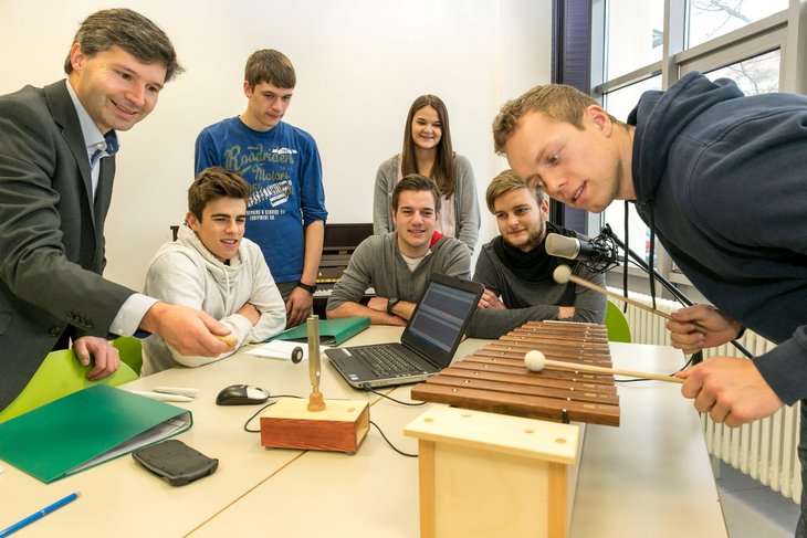 Die Themenführung Akustik umfasst Experimente zur Ausbreitung und Interferenz von Schall, zur Messung von Lärm, zum Schallschutz, zu Musikinstrumenten und zum Ultraschall.