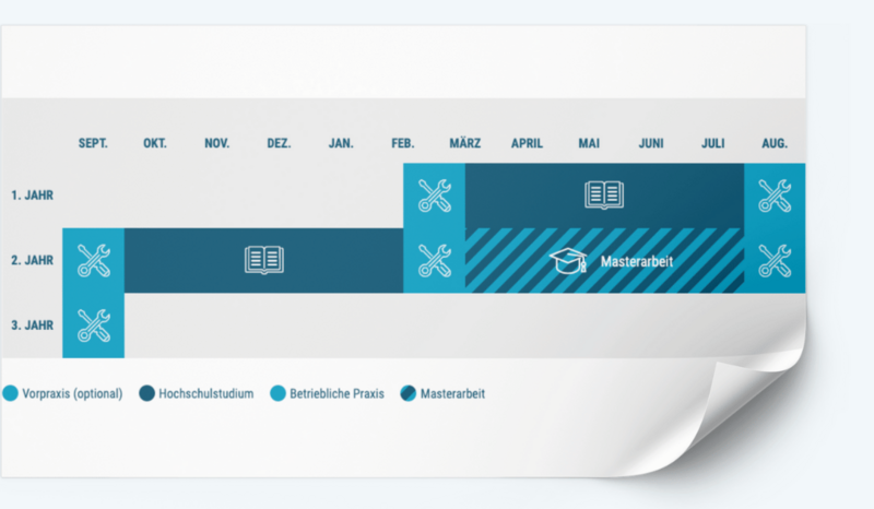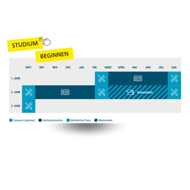 Jeweils im Winter- und oder Sommersemester startet dein Masterstudiengang an der Hochschule mit intensiven Praxisphasen im Praxispartner-Unternehmen, die eng an die Studieninhalte angelehnt sind (siehe Studienplan).