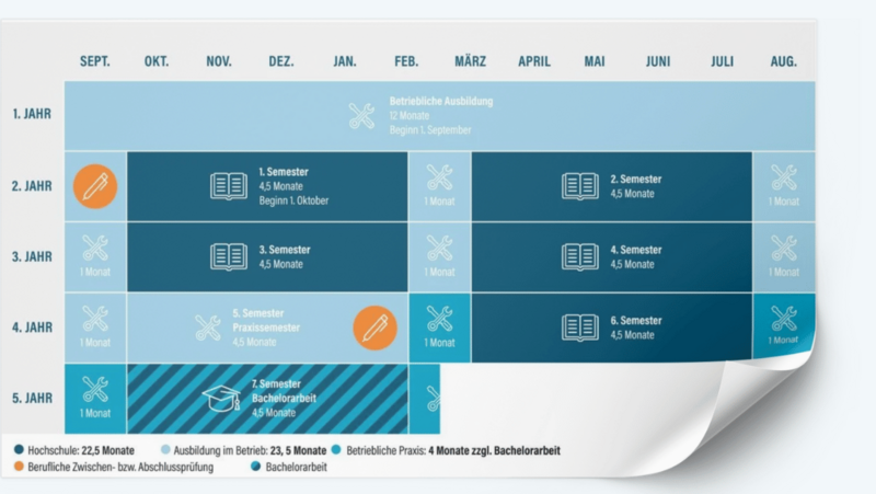 Die Praxisphasen finden dabei überwiegend in den vorlesungsfreien Zeiten statt, je nach Unternehmen wird auch eine gewisse Arbeitszeit während der Vorlesungszeit absolviert.