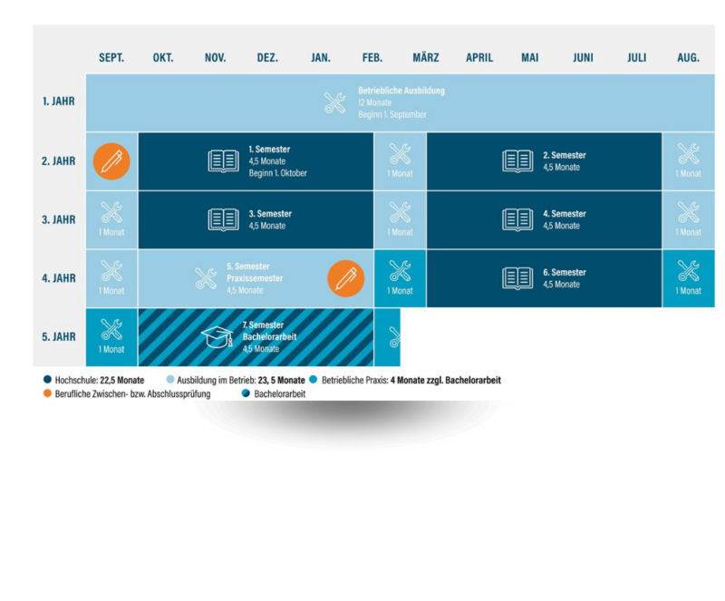 Nach deinem ersten Jahr im Betrieb beginnt dein Studium an der Hochschule Kempten. Hochschul- und Praxisphasen wechseln sich nun im Studium ab. Deine IHK-/HWK-Prüfung oder die anderer zuständiger Kammern absolvierst du je nach Berufsausbildungsdauer in der Regel im 3. Jahr bzw. 4. Jahr.