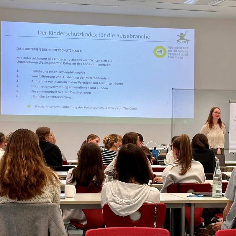 Die Referenten Leonie Schnieders und Arno Helfrich informierten weiterhin über den Kinderschutzkodex der Reisebranche „The Code“, der beispielhaft für die Umsetzung des Kinderschutzes steht. In Kleingruppen erarbeiteten die Studierenden anschließend für ein selbstgewähltes Tourismusunternehmen strategische und operative Ansätze zum Schutz der Kinder vor sexueller Ausbeutung.