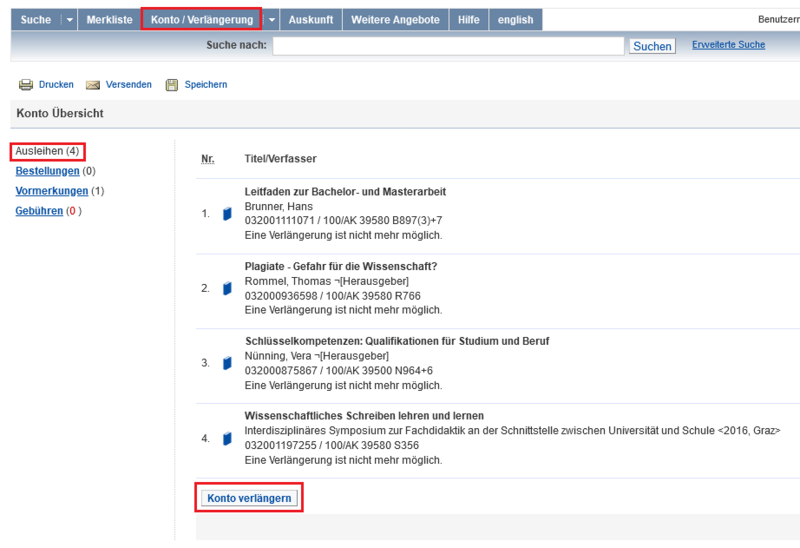 Studierende und Externe können ein entliehenes Medium maximal fünf Mal verlängern, sofern sich keine andere Person darauf vorgemerkt hat.