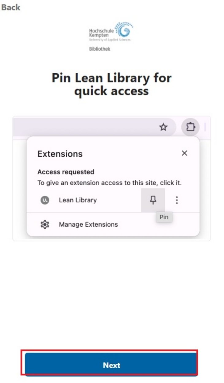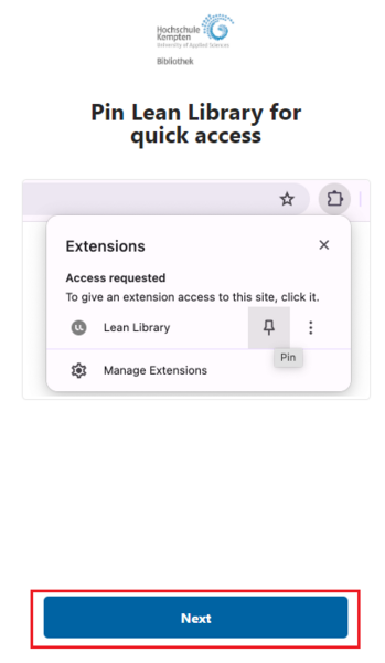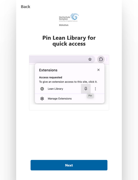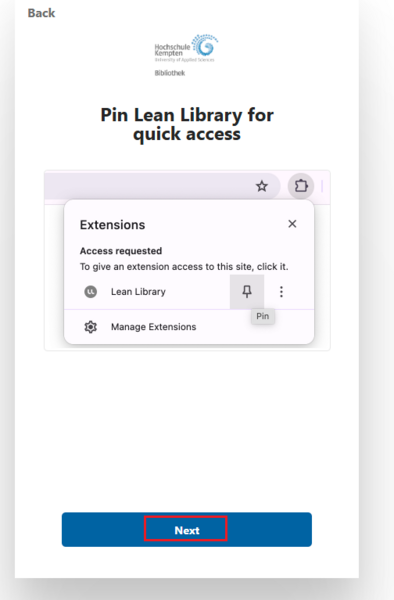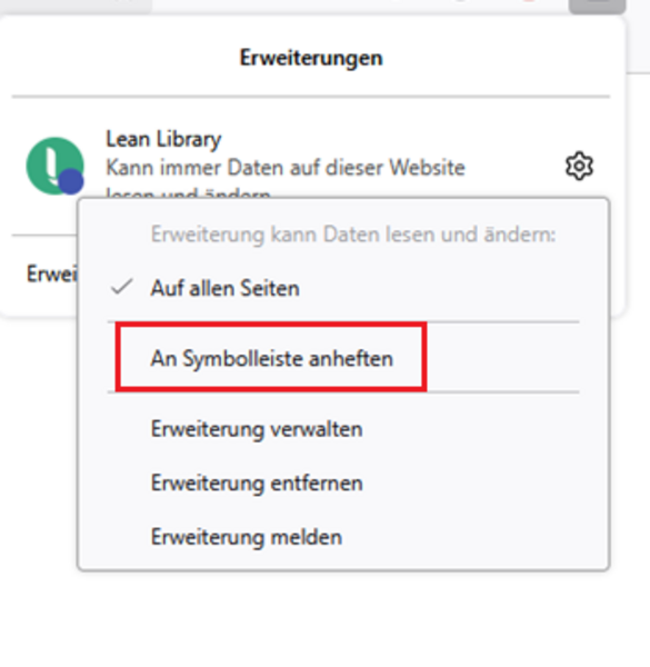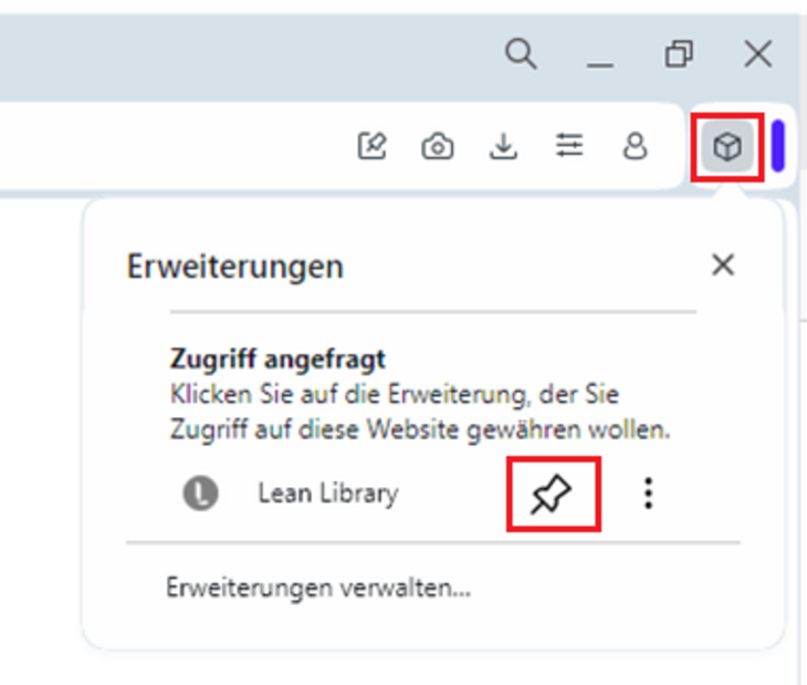 Klicken Sie dann oben rechts in der Symbolleiste Ihres Browser auf die kleine Box und anschließend auf den Pin rechts neben Lean Library. Wählen Sie "Fixieren".
