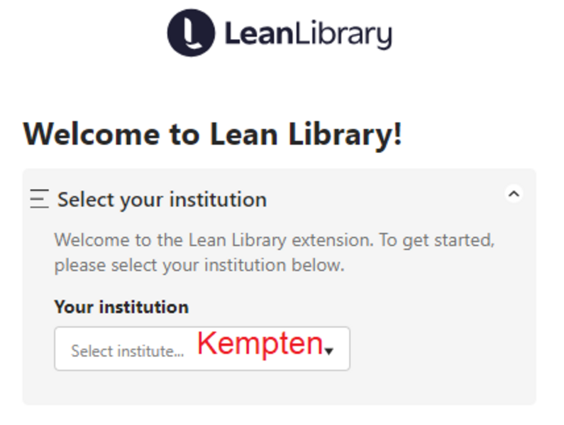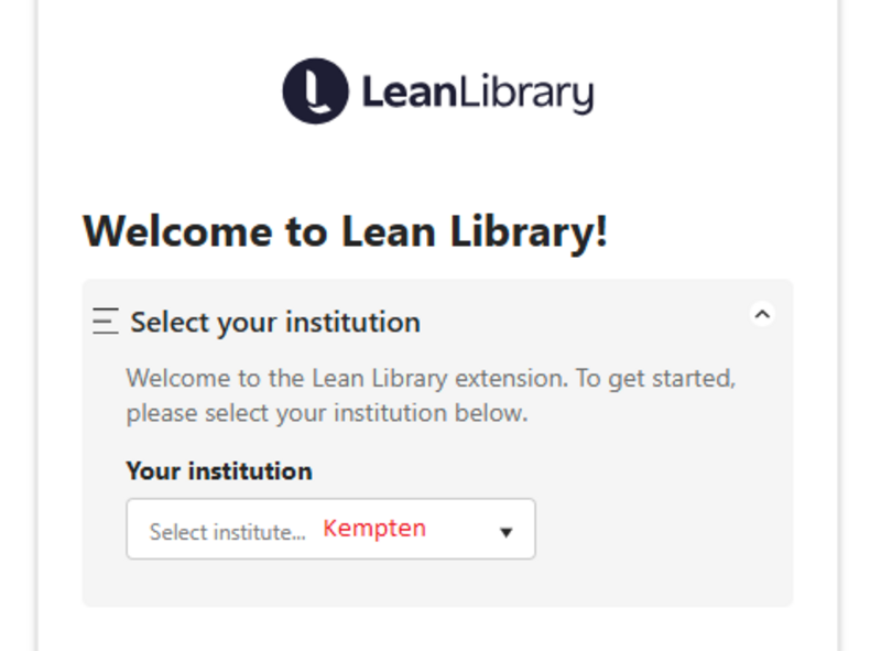 Wählen Sie aus der Liste oben Ihren Browser aus, installieren Sie das PlugIn und stellen Sie bei "Your institution" die Hochschulbibliothek Kempten ein.