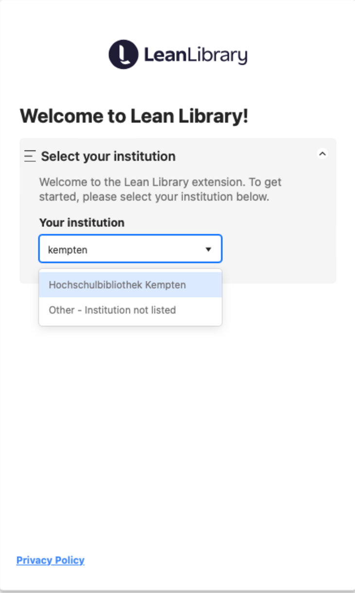 Es öffnet sich ein neuer Tab. Wählen Sie im Feld "Your institution" die Hochschulbibliothek Kempten aus. Geben Sie am besten in das Feld "Kempten" ein, dann wird unsere Bibliothek direkt angezeigt.