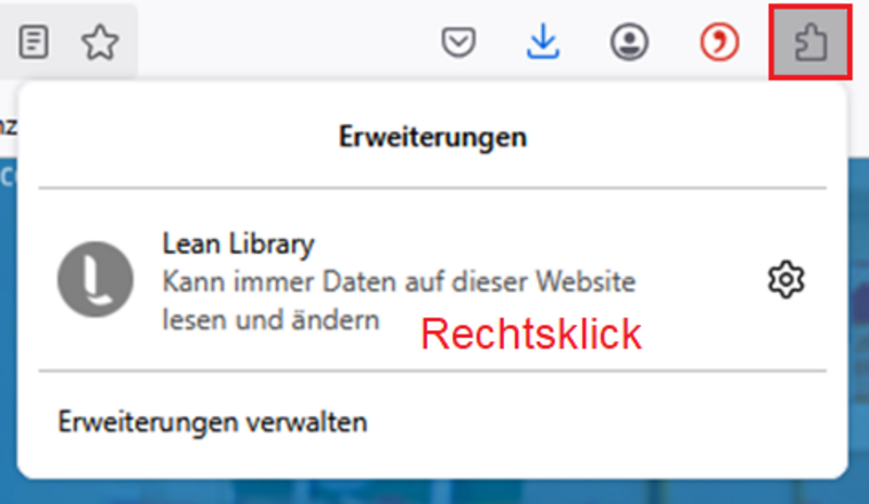 Klicken Sie dann oben rechts im Browser auf das Puzzleteil-Symbol. Machen Sie einen Rechtsklick auf Lean Library und wählen Sie "An Symbolleiste anheften".