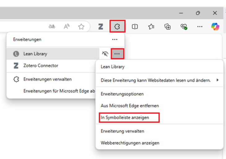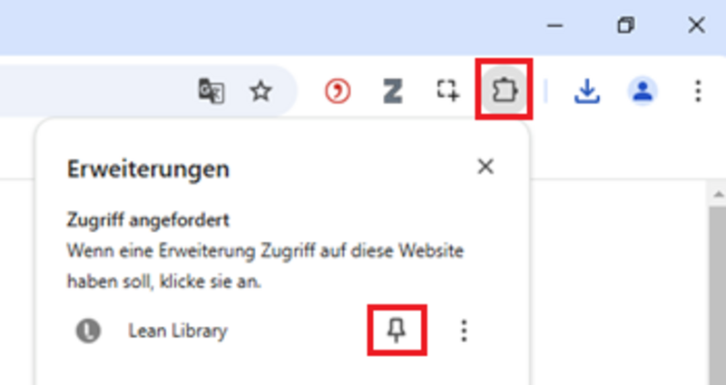 Klicken Sie anschließend in der Symbolleiste Ihres Browsers auf das Puzzleteil-Symbol. Klicken Sie auf die drei Punkte neben "Lean Library" und anschließend auf "In Symbolleiste anzeigen".
