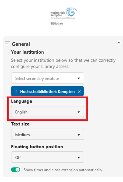 Es öffnet sich ein neuer Tab. Wählen Sie dort im Feld "Your institution" die Hochschulbibliothek Kempten aus. Am besten geben Sie einfach "Kempten" in das Feld ein, dann wird unsere Bibliothek direkt angezeigt.Sie können dort auch direkt die Sprache auf Deutsch ändern.
