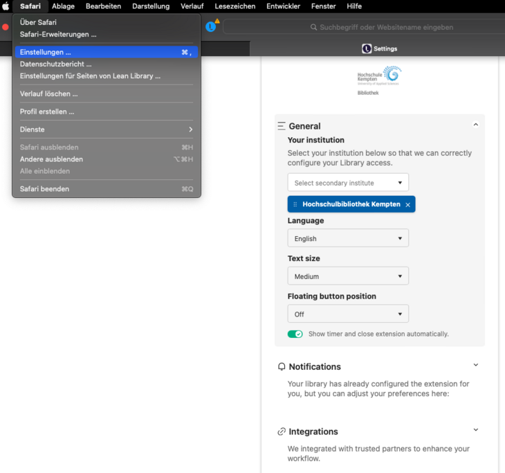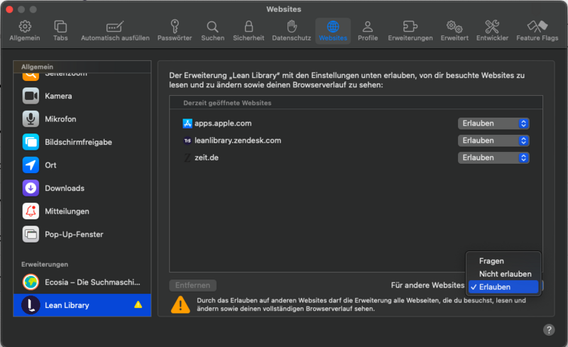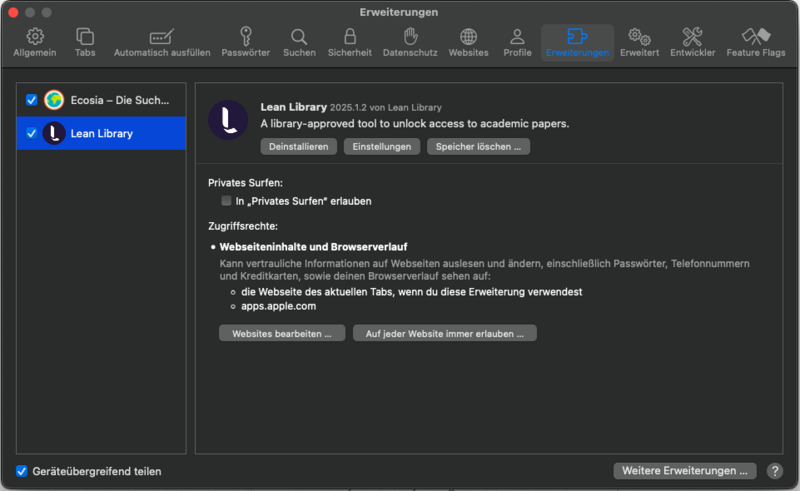 Eventuell müssen Sie anschließend noch einige Browsereinstellungen ändern. Klicken Sie auf "Safari" - "Einstellungen" - "Erweiterungen" - "Lean Library" und dann auf "Erlauben" (siehe Screenshots 4-6).