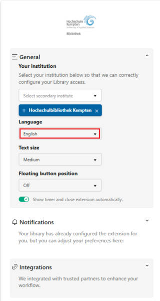Es öffnet sich ein neuer Tab mit Einstellungen für Lean Library.