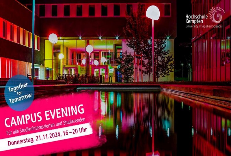 Dann bist du herzlich eingeladen, uns und unsere Studiengänge, am Campus Evening kennenzulernen, der am Donnerstag, den 21.11.2024, von 16:00 bis 20:00 Uhr im Gebäude S der Hochschule Kempten stattfindet! Komm mit uns ins Gespräch, und wir beantworten gerne deine Fragen zum Studium!