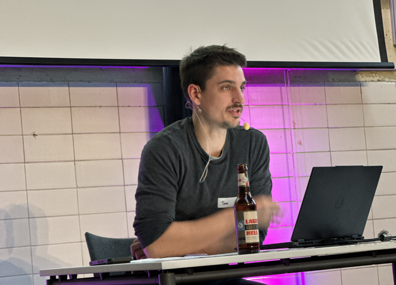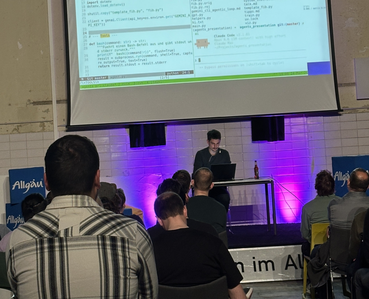 Speaker Thomas Stadelmann, Co-Founder von Skytala und Kollektivgeist, gab in seinem spannenden, kurzweiligen Vortrag einen tiefen fachlichen Einblick: von technischen Grundlagen über die Architektur von Coding-Agents bis hin zur Live-Implementierung auf der Bühne.