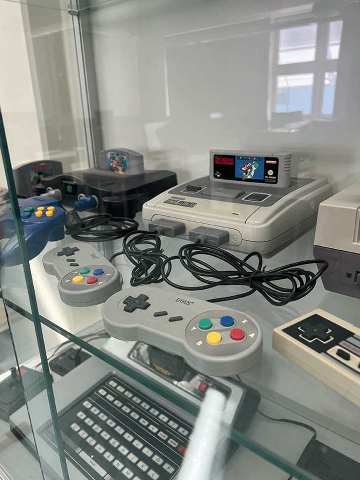 Neben Unity und Blender sind weitere Softwareentwicklungstools wie Adobe CS und Visual Studio für die Nutzung durch Studierende lizenziert und installiert. Die Mini-Ausstellung „Retro-Gaming“ zeigt frühe Konsolen und Spielgeräte aus den Anfängen der Computerspiele-Ära.