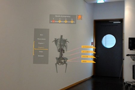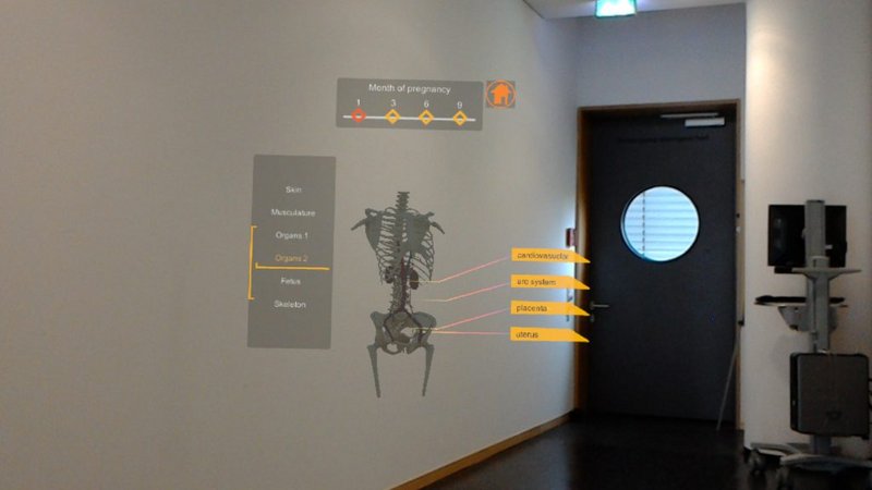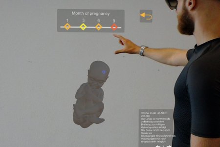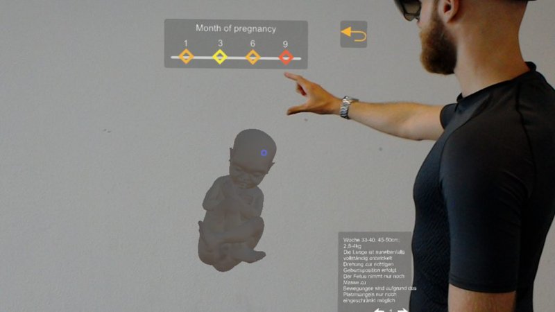 „Anatomie in der Schwangerschaft“ ist eine Augmented Reality Applikation für die Microsoft HoloLens. Die AR-Technik ermöglicht dem Nutzer virtuelle Objekte in einer realen Umgebung aus allen Perspektiven zu betrachten. Hier ist das Objekt ein anatomisch korrektes Modell einer schwangeren Frau in vier verschiedenen Schwangerschaftsstadien. Dieses Modell ermöglicht eine genaue Analyse der Veränderung der Anatomie von Frau und Kind. Hervorzuheben ist dabei die detaillierte 3D-Betrachtung einzelner Körperteile, die während der Schwangerschaft beeinflusst werden. Die interaktive Steuerung durch Gestiken ermöglicht eine genauere Betrachtung einzelner Körperteile, das Durchlaufen der Schwangerschaft sowie die Darstellung mehrerer anatomischer Schichten. Die Visualisierung wird unterstützt durch passendes Lehrmaterial. Daher eignet sich diese Anwendung für Lehr- und Ausbildungszwecke im medizinischen Bereich sowie die Begleitung und Vorbereitung einer Schwangerschaft.