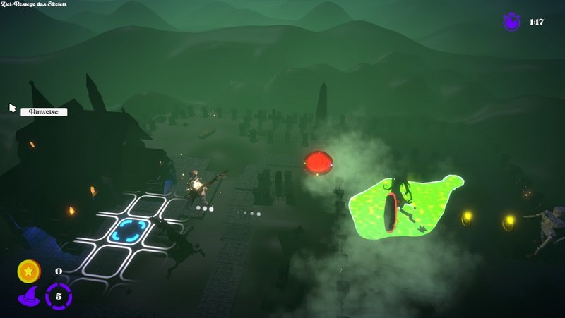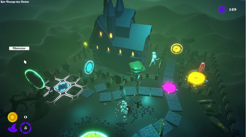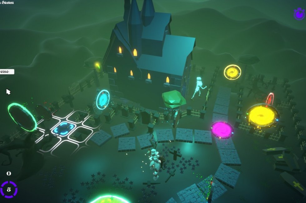 Verlassen in einer mysteriösen Ruine müssen die Spieler Portale umlenken, um das Skelett zu besiegen.