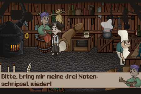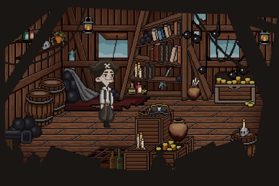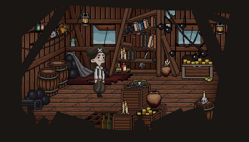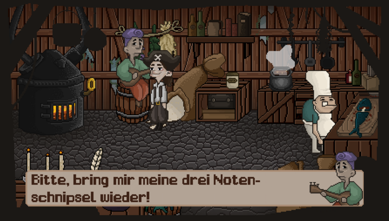 Ein pixelart Point and Click Adventure an Bord eines Piratenschiffs, bei dem musikalische Klänge auf den Duft der Seeluft treffen: Trage aktiv dazu bei, die hitzigen Gemüter der Crewmitglieder auf hoher See abzukühlen.