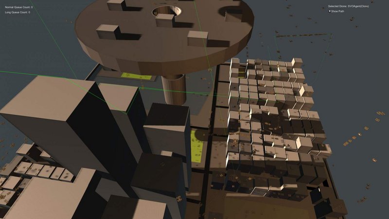 Ein Beispiel für einen solchen Aspekt in Videospielen ist die Pfadfindung und Bewegung von fliegenden Agenten im dreidimensionalen Raum. Während sich die Algorithmen nicht zwingend stark von den Methoden für die klassische Pfadfindung unterscheiden, stellt allein die Vergrößerung des Suchraums ein großes Problem für eine schnelle und effiziente Pfadsuche