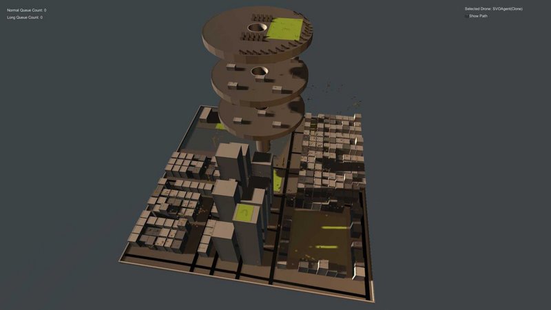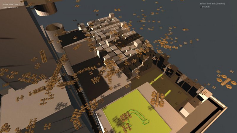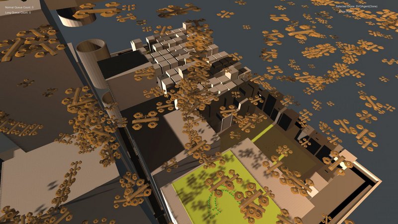 zur Laufzeit dar. Deshalb befasst sich diese Arbeit mit der Untersuchung und der Implementierung verschiedener Möglichkeiten, mit denen eine performante Pfadfindung und Simulation für mehrere tausend Einheiten zur Laufzeit umgesetzt werden kann. Die hierbei