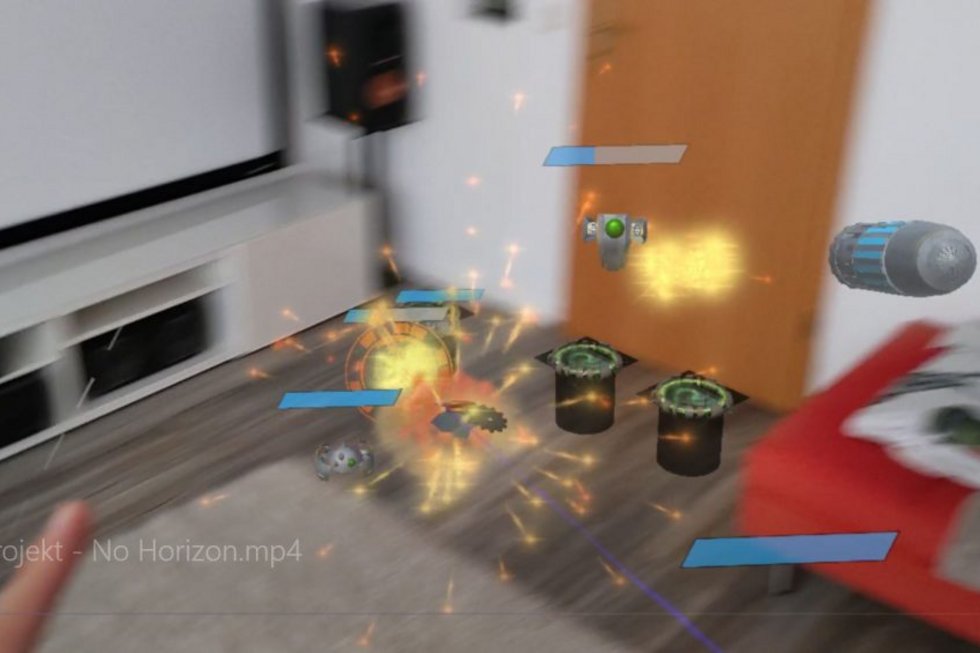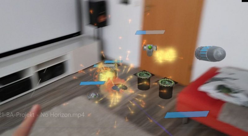 No Horizon ist ein AR Egoshooter für die Hololens 2. Der Spieler stürzt mit seinem Raumschiff auf einem fremden Planeten ab. Auf dem Planeten wird das abgestürzte Schiff von feindlichen Robotern angegriffen, welche die Ressourcen des Schiffs haben wollen. Der Spieler muss das Schiff verteidigen und versuchen fallengelassene Schrotteile der zerstörten Gegner einzusammeln. Mit diesen kann er Verteidigungsanlagen wie Geschütztürme und Wände bauen. Ziel des Spiels ist es das Raumschiff mit den Schrotteilen der Gegner zu reparieren und somit von dem Planeten zu entkommen. Das Spielfeld ist der Raum in welchem sich der Spieler befindet. Die Hololens scannt den Raum und erzeugt damit ein virtuelles Mesh auf welchem sich die Gegner bewegen und Verteidigungsanlagen platziert werden können. Der Spieler kann mit seiner Blickrichtung zielen und mittels Gestensteuerung schießen.