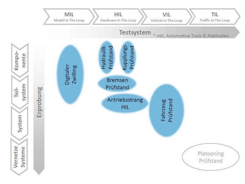 Derzeit umfasst das Labor eine Fläche von ca. 150m² und verfügt über 4 leistungsstarke Antriebseinheiten, diverse Aktuatorik, ein breites Spektrum an Steuerungen, HardwareInTheLoop Systemen sowie über eine umfangreiche Simulations- und Softwaretoolkette.