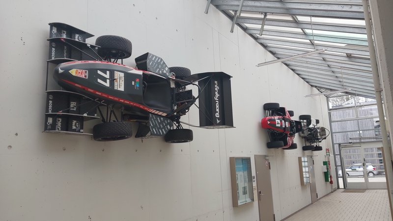 Drei vom Infinity Racing Team der Hochschule Kempten zur Verfügung gestellte Fahrzeuge wurden an der Wand im Gang der Maschinenhalle aufgehängt.