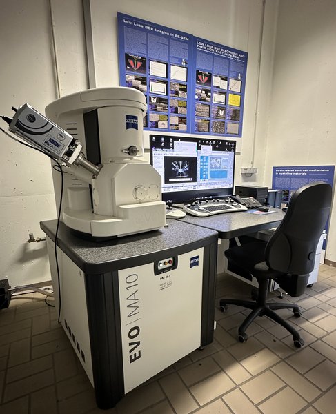 In unserem Labor für Werkstofftechnik steht ein Rasterelektronenmikroskop (REM) vom Typ Zeiss EVO MA 10 für Mikroanalysen zur Verfügung. Das REM ist mit einem energiedispersiven Röntgenspektrometer (EDS) ausgestattet. Das System eignet sich ideal zur Analyse unebener Oberflächen, einschließlich Bruchstrukturen und ermöglicht Aufnahmen mit hoher Tiefenschärfe.