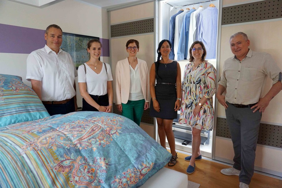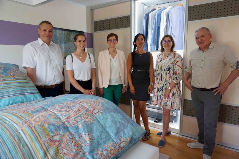 Mit großem Interesse ließen sich die Besucherinnen und Besucher die technische Ausstattung des AAL Living Labs zeigen. AAL steht für „Ambient Assisted Living“ oder „Active and Assisted Living“ und bezeichnet vornehmlich technische Unterstützungssysteme, die gesundheitlich eingeschränkten Menschen ein möglichst selbstbestimmtes Leben ermöglichen sollen. Neben einer Küche mit unterfahrbaren, höhenverstellbaren und selbstöffnenden Schrankelementen ist die Lehr- und Forschungswohnung auch mit Systemen zur Sturzprävention und -erkennung ausgestattet. Sie verfügt außerdem über ein Smart Home-System, biodynamisches Licht sowie ein Bad mit Dusch-WC mit Sensorik für Vitalwerte und telemedizinischen Systemen. Highlight der Wohnung ist das Aufstehbett im Schlafzimmer.