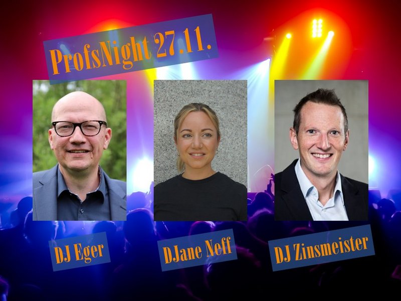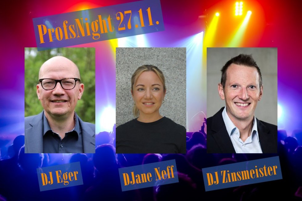 Es ist wieder so weit: am Donnerstag, 27. November verstärkt die Fakultät Soziales und Gesundheit das DJ-Team bei der ProfsNight im Parktheater Kempten! Mit am Start sind diesmal die Neulinge Jennifer Neff und Prof. Dr. Frank Eger sowie der „Wiederholungstäter“ Prof. Dr. Marcus Zinsmeister.