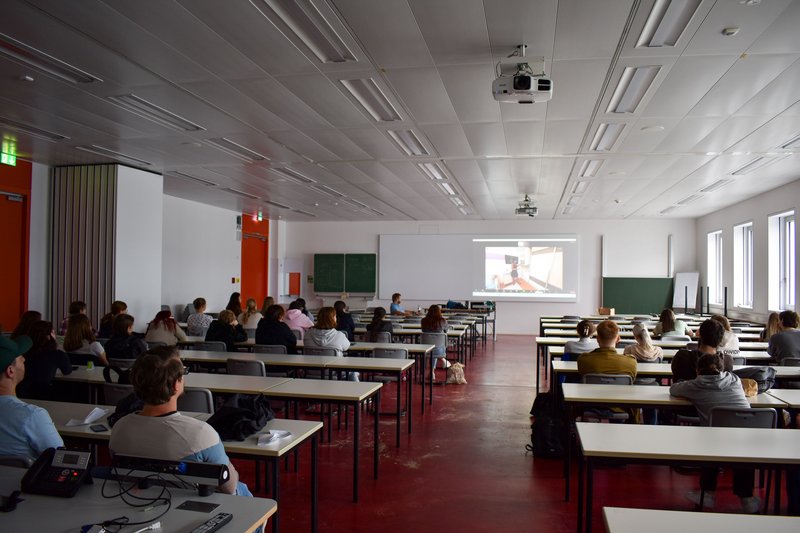 Vor Ort führte Laboringenieurin Chantalle Schubert durch die Wohnung, unterstützt durch ihre Kollegin Kristina Knobloch an der Kamera. Zwei Schülerinnen der FOSBOS Kaufbeuren besichtigten die Wohnung persönlich. Die Aufnahme wurde live in einen Hörsaal auf dem Campus übertragen, wo Prof. Dr. Thomas Schmid, Campustag-Mitorganisator von der Fakultät Soziales und Gesundheit, und weitere Schülerinnen und Schüler via Zoom an der virtuellen Führung teilnahmen.
