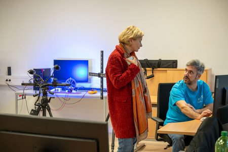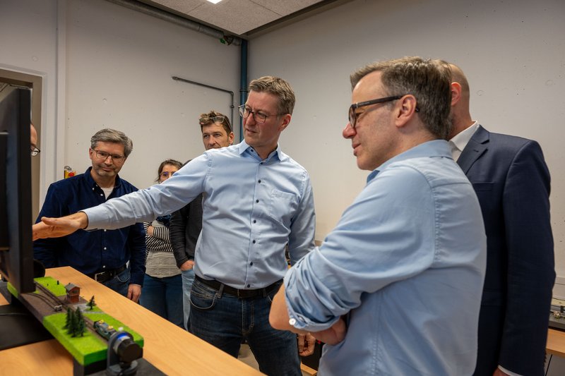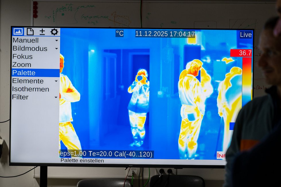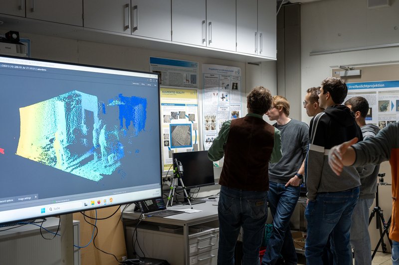 Im Anschluss konnten die im Institut abgedeckten Anwendungen erkundet und ausgetestet werden. An verschiedenen Stationen erklärten Mitarbeitende des IMS die eingesetzten Systeme und laufenden Forschungsprojekte. Schwerpunkte bildeten dabei die dreidimensionale Messtechnik mit 3D-Messarmen sowie eine Time-of-Flight-Kamera - ergänzt durch Drohnen mit optischen Sensoren sowie eine Thermalkamera.