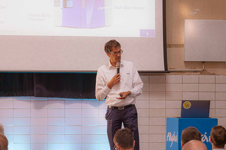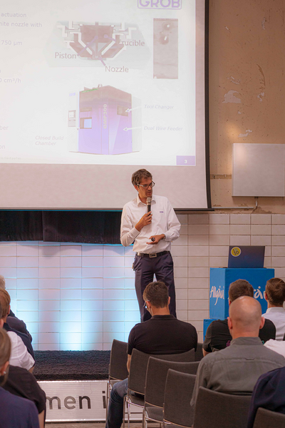 Im Rahmen seines Vortrags präsentierte Dr. Johannes Glasschröder das Liquid Metal Printing-Verfahren von GROB. Dabei handelt es sich um eine pulverlose Technologie zur additiven Fertigung endkonturnaher Bauteile. Ziel ist additiv gerechte Komponenten zu entwickeln und dabei das volle Potenzial für die Produktion zu erschließen.