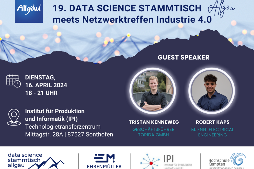 Das nächste Netzwerktreffen Industrie 4.0 findet zusammen mit dem Data Science Stammtisch Allgäu am 16. April, 18-21 Uhr, am IPI in Sonthofen statt.