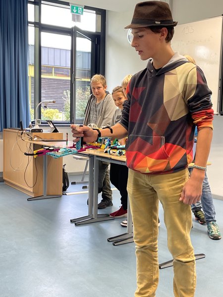 „Zum eingestellten Zeitpunkt ist es sonnig“, tönt es aus dem Tablet. Der kleine, über Bluetooth verbundene Roboter hat soeben das Wetter über Farbsensoren vorhergesagt. Und er kann noch mehr, zum Beispiel Hindernisse während der Fahrt erkennen und überwinden. Stolz zeigen die Schüler der Klassen 6a, 6b und 8a, was sie in den bisherigen fünf Doppelstunden gemeinsam mit Kursleiter Daniel Schaffner ausgetüftelt haben. Zunächst ging es für die 16 Schülerinnen und Schüler des Wahlkurses darum, dass umfangreiche Material aus den zehn Lego-Robotik-Sets zu sortieren und die Sensoren kennenzulernen, die auf Farben, Neigungswinkel und Abstände reagieren. Die Sets haben einen direkten Lehrplanbezug der MINT-Fächer für die weiterführende Schule. „Die erste Challenge war dann ein kleines Wettrennen“, kommentiert Schaffner ein kurzes Video, in dem kleine Roboter über den Flur flitzen und vereinzelt auch mal einen ungeplanten Überschlag machen.
