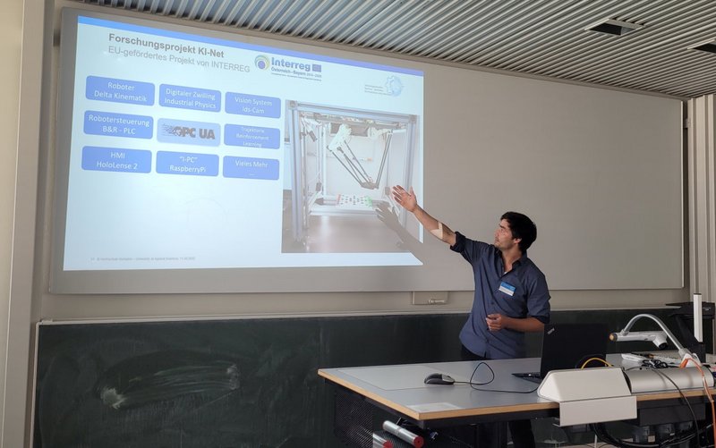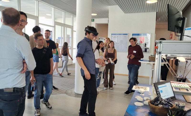 Vielen Dank noch einmal für das große Interesse an unserem Stand im Gebäude W! Neben interessanten Einblicken in die innovativen Forschungsvorhaben am Forschungszentrum Allgäu gab es hier auch Forschung zum Anfassen und Ausprobieren: Marco Ullrich hatte den Mühle spielenden Roboter aus dem Forschungsprojekt KI-Net mitgebracht. Mit der Hololense konnten auch die Messebesucher*innen den Roboter selbst steuern.