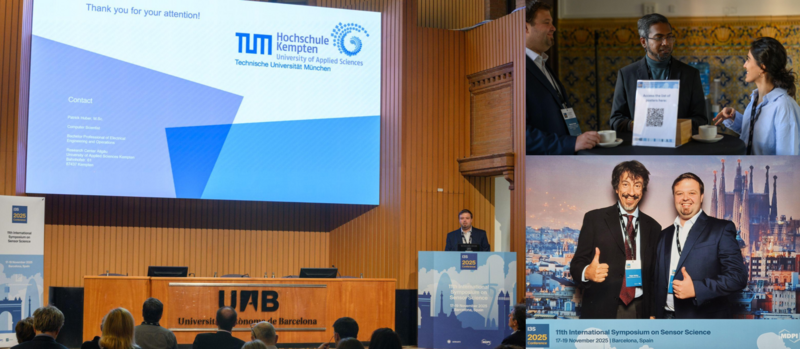 Im Rahmen des 11th International Symposium on Sensor Science (I3S 2025) in Barcelona präsentierte Patrick Huber, Promovierender der Hochschule Kempten und der Technischen Universität München, aktuelle Ergebnisse seiner Forschungsarbeit. Die internationale Konferenz brachte Wissenschaftlerinnen und Wissenschaftler aus Forschung und Industrie zusammen, um neue Entwicklungen und Herausforderungen im Bereich der Sensorwissenschaften zu diskutieren.