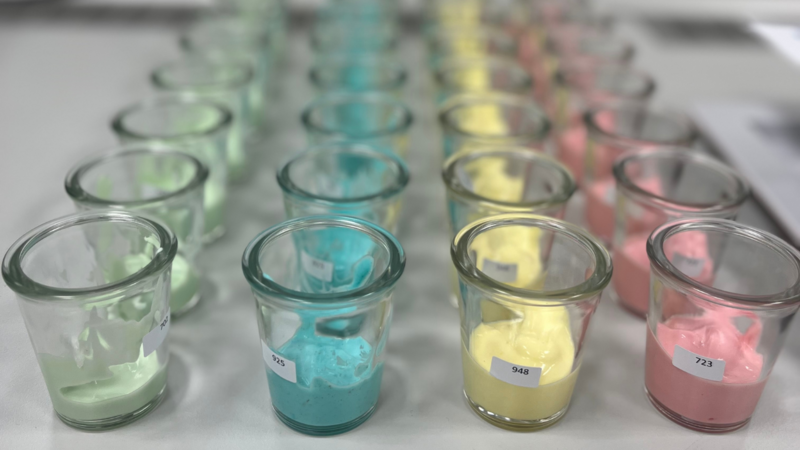 Nadja Krammel: Ja, das ist der Test für die Geschmackserkennung. Hier geht es darum ohne Hilfestellung die hinzugefügten Aromen zu erkennen oder möglichst genau zu beschreiben. Dabei kann ich mir immer neue Kombinationen einfallen lassen, zum Beispiel aus Gewürzen, wie Zimt oder Salz, aus Früchten, wie Orange oder Zitrone, aus Kräutern, wie Basilikum oder sogar auch aus Süßigkeiten, wie beispielsweise Karamell. Diese gebe ich dann in den Joghurt. Der Joghurt ist in diesem Fall die "Matrix", die Gesamtheit aller Zutaten oder Stoffe des Tests. Als Matrix können auch Milch, Frischkäse oder Säfte verwendet werden. Da unsere Erwartungen an den Geschmack eines Lebensmittels stark von der Farbwahrnehmung und den damit verknüpften Erfahrungen abhängig sind, färbe ich die Proben mit knalligen Lebensmittel-Farben ein. Damit versuche ich natürlich nicht nur das Panel durcheinander zu bringen. Ich möchte damit auch Rückschlüsse verhindern, die zum Beispiel auf Grund der dunkleren Farbe des mit Kakao versehenen Joghurts gemacht werden. Bei diesem Test müssen alle Geschmäcker zumindest richtig eingeordnet bzw. beschrieben werden, sonst wird die Prüfung nicht bestanden. Nach dieser Prüfung ist die Grundlagenschulung für alle geschafft und ich kann mit der Auswertung starten!