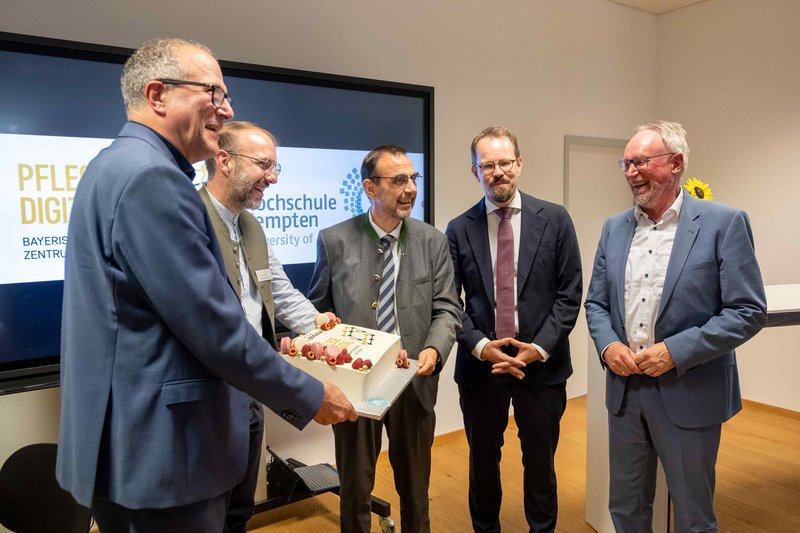 Foto: Zur 5-Jahres-Feier gibt es auch eine Geburtstagstorte. V. l. n. r. Alexander Hold, Vize-Landtagspräsident, Alexander Karl, operativer Leiter des BZPD, Klaus Holetschek, CSU-Fraktionsvorsitzender, Prof. Dr. Mario Jokisch, wissenschaftlicher Leiter des BZPD sowie Prof. Dr. Wolfgang Hauke, Präsident der Hochschule Kempten; Bildnachweis: Hochschule Kempten/Jens