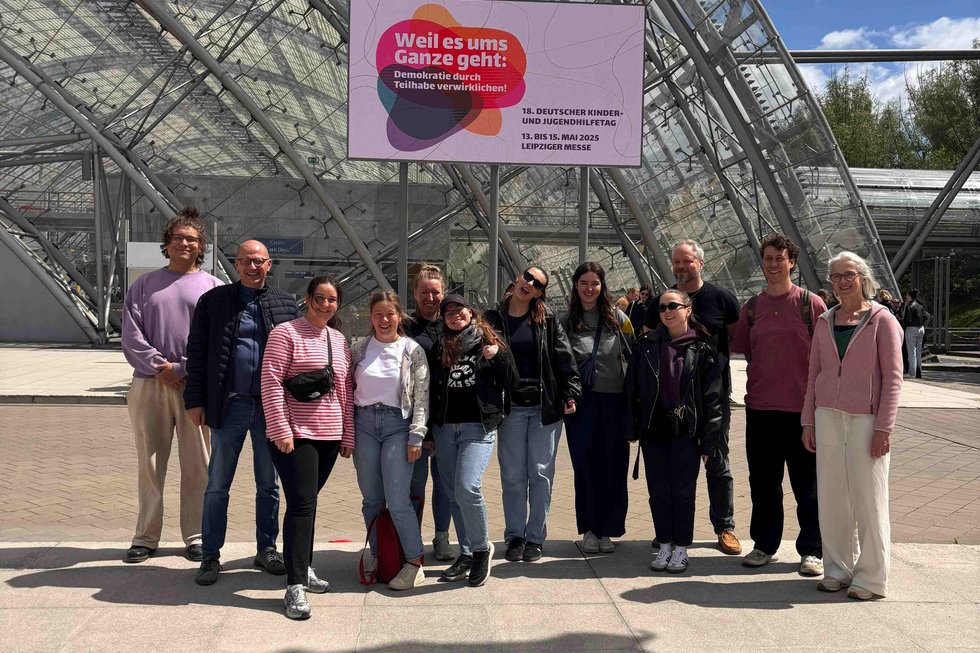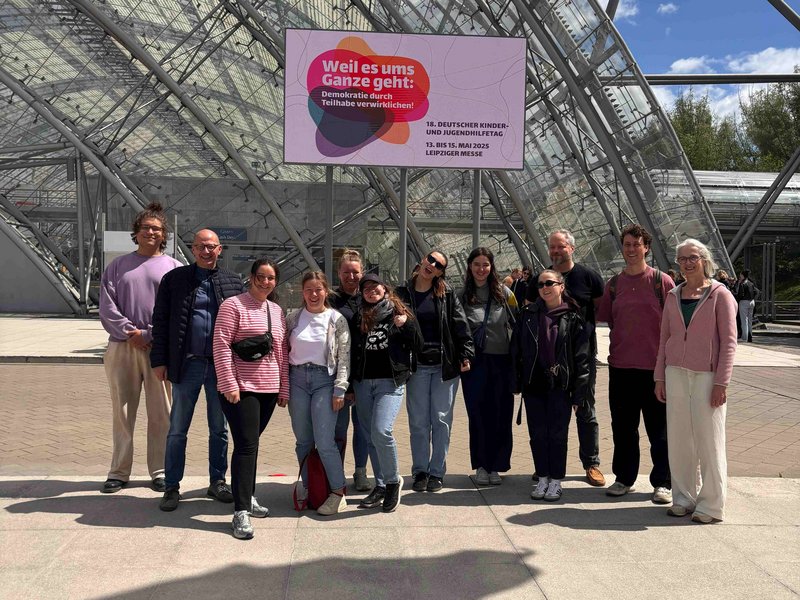 Im Rahmen einer Exkursion nach Leipzig vom 13. bis 15. Mai 2025 haben zehn Studierende des Studiengangs Soziale Arbeit mit Prof. Dr. Regina Münderlein und Prof. Dr. Frank Eger am Deutschen Jugendhilfetag (DJHT) auf der Messe Leipzig mit insgesamt 13600 Besucherinnen und Besuchern teilgenommen. Die Studierenden haben sich auf dem Jugendhilfetag, der größten Veranstaltung dieser Art in Europa, mit aktuellen Entwicklungen der Kinder- und Jugendhilfe vertraut gemacht. Ziel der Reise war es, im Kontakt mit Trägern der Kinder- und Jugendhilfe und in Workshops neue Perspektiven auf eine Vielzahl von Themen zu gewinnen. Die Messe mit ihren 300 Ständen und insgesamt 285 Veranstaltungen bot zu diesem Anlass eine reiche Auswahl.