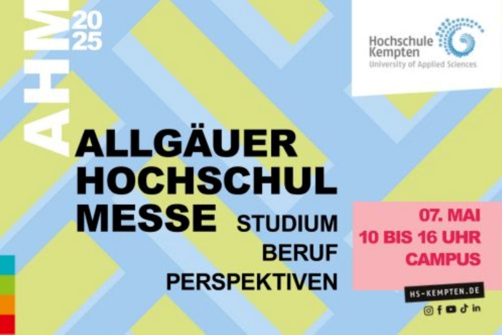Diesen Mittwoch, 7.5. ist es wieder so weit: die Hochschule Kempten öffnet von 10 bis 16 Uhr ihre Türen für die Allgäuer Hochschulmesse 2025! Sowohl für Studieninteressierte als auch für Studierende und Absolventinnen und Absolventen ist einiges geboten: