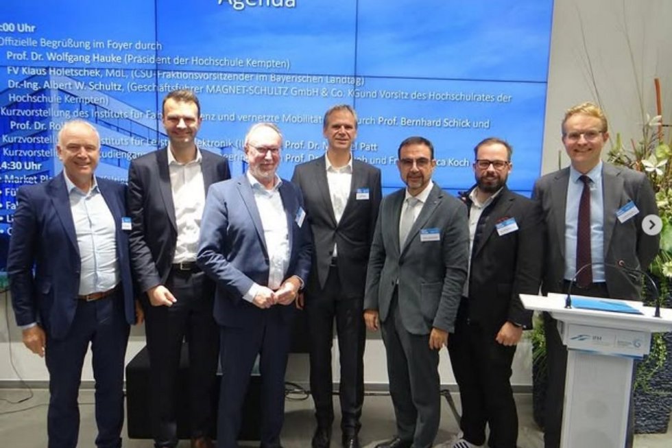 Foto: v. l. n. r. Prof. Bernhard Schick, Leiter IFM, Dr. Florian Dorn, MdB, Prof. Dr. Wolfgang Hauke, Hochschulpräsident, Prof. Dr.-Ing. Dirk Jacob, Vizepräsident für Lehre und Weiterildung, Klaus Holetschek, MdL,Jan Rothenbacher, Oberbürgermeister Stadt Memmingen und Dr. Albert W. Schultz, Geschäftsführer Magnet-Schultz GmbH & Co. KG und Vorsitzender des Hochschulrats der Hochschule Kempten