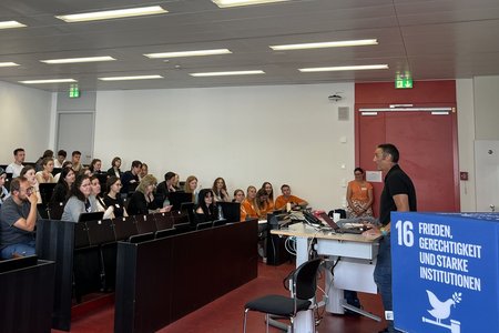 Im Anschluss an die Begrüßung durften die Teilnehmerinnen und Teilnehmer direkt Hochschulluft schnuppern. Prof. Dr. Claus Loos verstand es mit seiner Schnupperlehrveranstaltung, dem Fach Recht mit gewohnter Souveränität den Schrecken zu nehmen: „Wer nicht arbeiten will, soll auch nicht essen?“ – Leistungsminderung beim Bürgergeld als Folge einer Pflichtverletzung. Die Teilnehmenden engagierten sich lebhaft in der Diskussion und haben zukünftig hoffentlich weniger Scheu vor den Rechtsvorlesungen.