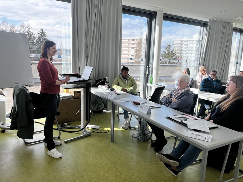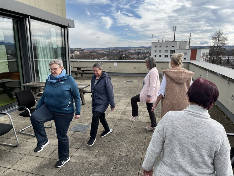 Auf den theoretischen Teil folgt eine Praxisübung: Gemeinsam setzt sich die Gruppe in einen Stuhlkreis. Eine teilnehmende Person leitet eine ihr zugewiesene Bewegungsübung so an, als wären die anderen ebenfalls pflegebedürftige Menschen. Für die Anleitungen gibt es im Anschluss sowohl aus der Gruppe als auch von den Projektleiterinnen Feedback.
