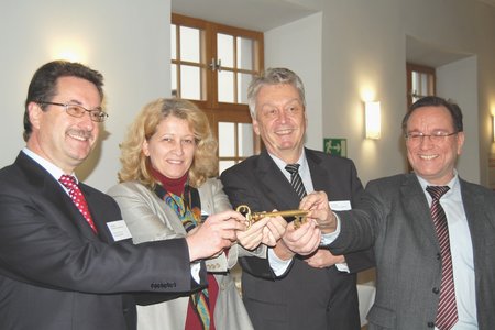 Foto 3: Archivfoto der Schlüsselübergabe am 17. Dezember 2009 (v. l. Prof. Dr. Robert F. Schmidt (damaliger Präsident der Hochschule Kempten), Prof. Dr. Uta M. Feser (Präsidentin der Hochschule Neu-Ulm), Prof. Dr.-Ing. Hans-Eberhard Schurk (damaliger Präsident der Hochschule Augsburg), Thomas Mayer (ehemaliger Direktor des Amtsgerichts Neu-Ulm). Bildnachweis: Illertisser Zeitung