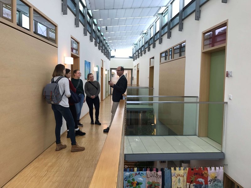 Ziel der Exkursion war, sowohl die Abläufe und die Organisation als auch die Finanzierung der Hospizarbeit kennenzulernen. Neben dem Vortrag zur Finanzierung der Hospizarbeit, vorgetragen von Alfons Regler, Geschäftsführer des Kinderhospiz St. Nikolaus, ermöglichte der Tag der offenen Tür den Studierenden darüber hinaus, die Räumlichkeiten des Kinderhospizes zu besichtigen. Der Zugang zu den Elternzimmern, zu den Räumlichkeiten für Physio-, Wasser-, Montessori-, Musik- und Maltherapie, zum Wohnzimmer und Esszimmer mit offener Küche, in der das Personal frisch für alle kocht, unterstrichen die gemütliche Atmosphäre im Kinderhospiz St. Nikolaus. Die Kapelle, das Abschiedszimmer und der sogenannte Fahnengarten lassen aber nicht vergessen, dass auch Trauer und Schmerz hier unabwendbar eine große Rolle spielen.