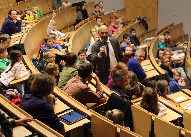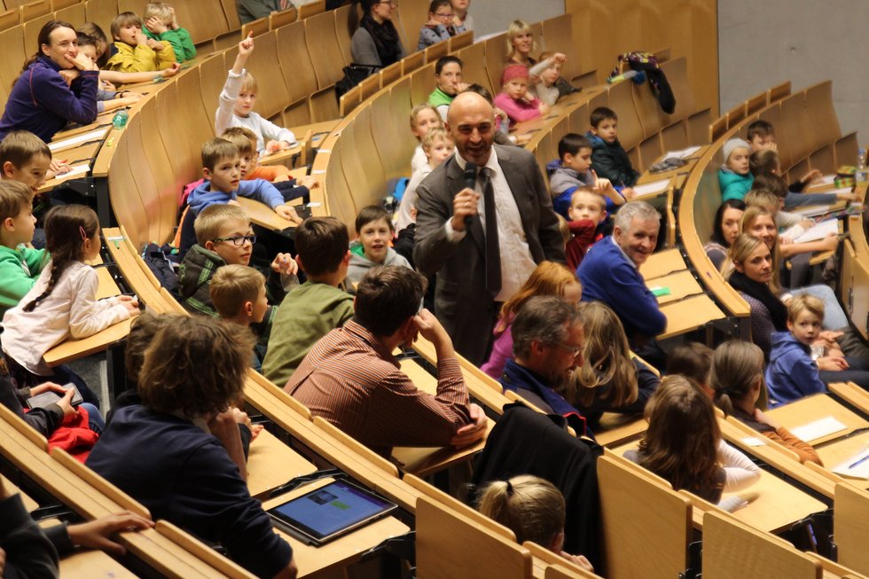 Foto: Kinderuni-Vorlesung mit Prof. Dr. Martin Göbl an der Hochschule Kempten. Bildnachweis: Hochschule Kempten / Sybille Adamer