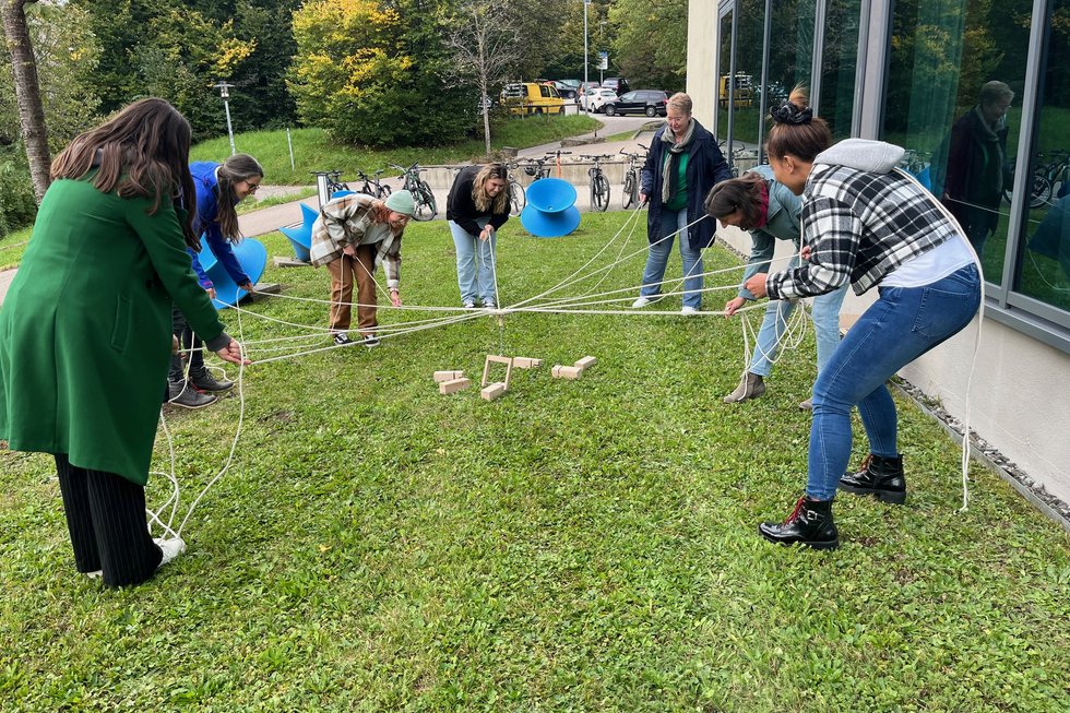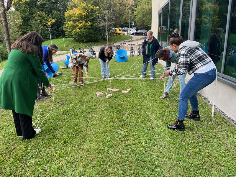 Die Studierenden waren beeindruckt, wie ihre Gruppe stillschweigend Absprachen traf und ihr Vorgehen auf die jeweilige Notwendigkeit anpasste. Unter großem Gelächter stürzte der Turm schließlich um. Das Teamerlebnis sorgte für eine gute Basis im weiteren Semesterverlauf.