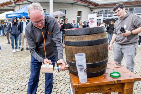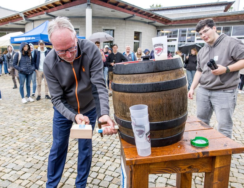 Fotos: Impressionen Erstsemestertag und Hochschulpräsident Prof. Dr. Wolfgang Hauke beim Festbieranstich im Erstigarten; Bildnachweis: Hochschule Kempten/R. Lienert