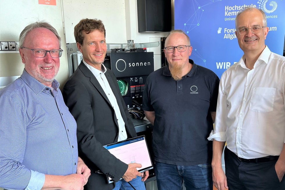 Foto: Offizielle Inbetriebnahme des Batteriespeichers des Energieanbieters sonnen an der Hochschule Kempten. V. l. n. r. Hochschulpräsident Prof. Dr. Wolfgang Hauke, Prof. Dr. Holger Hesse, Philip Rother, System Development Engineer bei sonnen und Ralf Plieninger, CTO der sonnen GmbH. Bildnachweis: Hochschule Kempten / S. Adamer