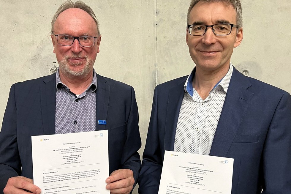 Die Hochschule Kempten und die Staatliche Fach- und Berufsoberschule Kempten (FOSBOS Kempten) haben ihre erfolgreiche Zusammenarbeit jetzt auch offiziell besiegelt: Mit der Unterzeichnung einer Kooperationsvereinbarung wird die bereits seit vielen Jahren gelebte Partnerschaft auf ein festes Fundament gestellt. Ziel ist es, junge Menschen frühzeitig für wissenschaftliche Themen zu begeistern, den Übergang von der Schule ins Studium gezielt zu begleiten und die Bildungsregion Schwaben aktiv mitzugestalten.